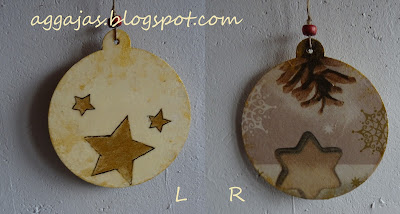 Już mam pewne pomysły jak można zrobić takie wisiadełka w przyszłym roku :). A na razie było standardowo: biała farba, serwetka, złota farba, lakier, sznurek i koralik :). Czasem jeszcze elementy dodatkowe.... ale to zobaczycie później (mam nadzieję).